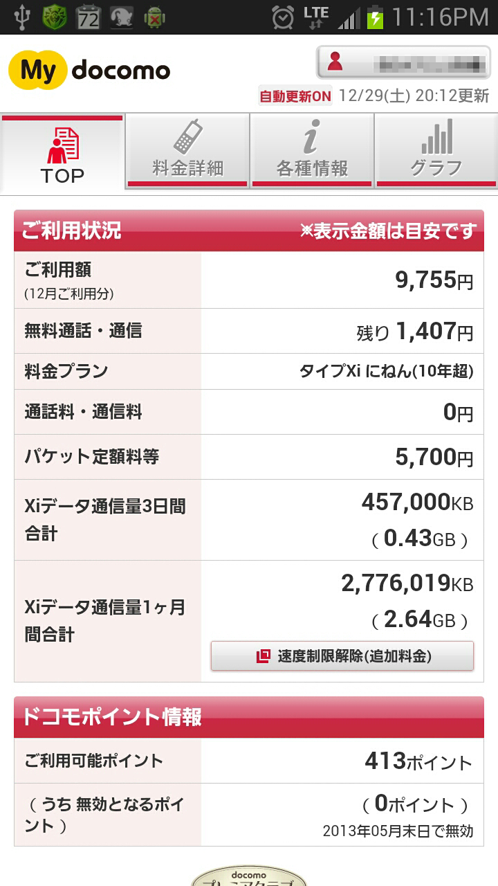 Galaxy NoteⅡ(SC-02E)に機種変したのが11月中旬だったので今月12月が初めて1ヶ月間のデータ通信量を測れるのですが、Xi(LTE)になって少しデータ通信量が増えているようですね。